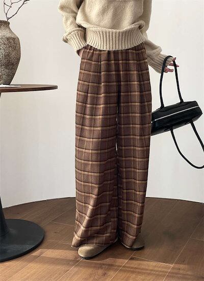 チェック ワイドパンツ レディース タックパンツ 秋 冬 ボトムス ロング丈 ウエストゴム パンツ ポケット ふんわり ズボン あったか ゆったり リラックス ウールタッチ ハイウエスト おしゃれ 美