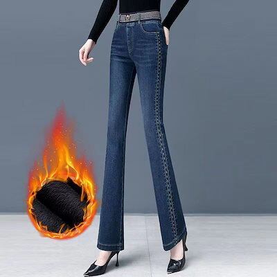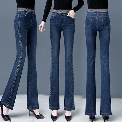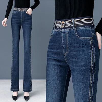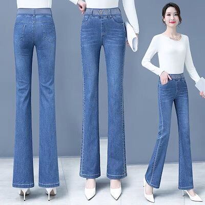 デニムパンツ ウエストゴム ジーンズ レディース 春秋 ストレッチ ハイウエスト パッド入り フレアパンツ 韓国ファッション