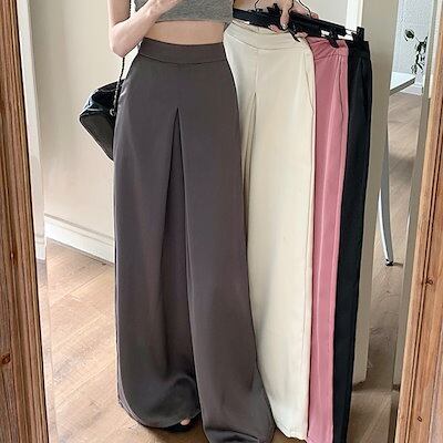 2024 春夏パンツ サテン シルク ワイド ウエストゴム ハイウエスト 脚長効果 美脚効果 細見え ゆったり 春 白 韓国ファッション レディース お出かけ