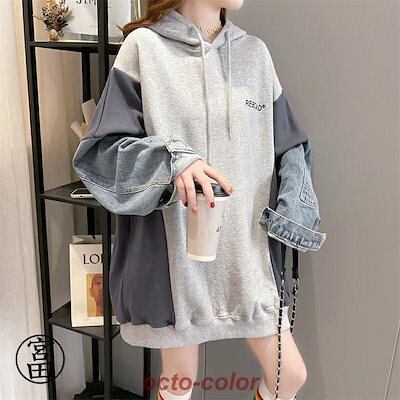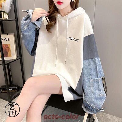 パーカー レディース 大きめ 裏起毛 暖かい デニム切り替え おしゃれ オーバーサイズ トップス 長袖 切り替え デニム スウェットフード付きトレーナー 大きい