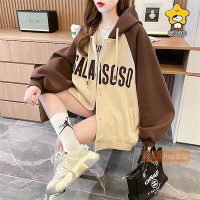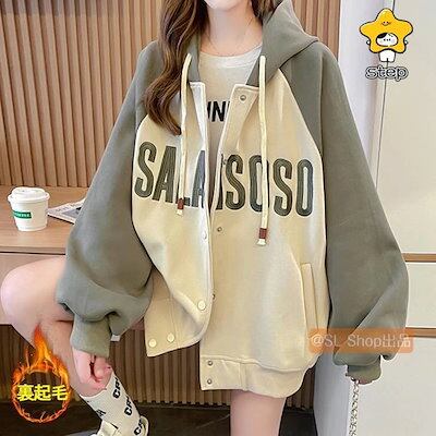 パーカーレディース長袖冬トップス裏起毛厚暖かい英字柄ジップアッププルオーバーゆったりシンプル配色ロング丈冬服