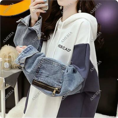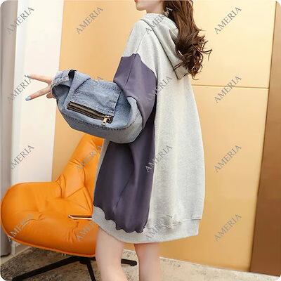プルオーバー パーカー デニム切り替え オーバーサイズ 異素材mix スウェット 薄手 トップス 長袖 レトロ 韓国ファッション レディース 大人可愛い ガーリー