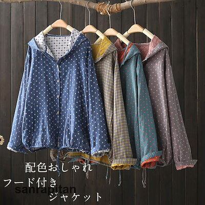 パーカー フード付き 秋 配色 レディース 羽織 トップス 羽織り 長袖 総柄 綿 コットン シャツパーカー 軽い 薄手 ライトコート ジャケット アウター