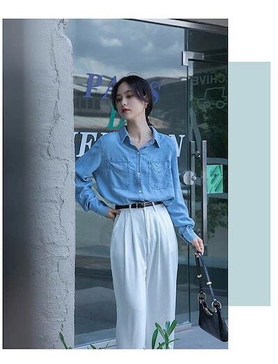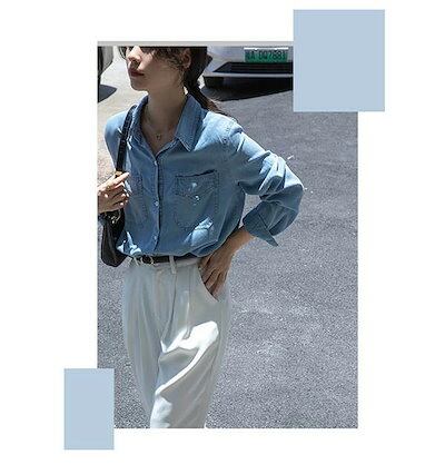 デニムシャツ ブラウス レディースシャツ トップス 薄手 涼しい 前開き ボタン 胸ポケット 長袖あり 袖付き カジュアル リゾート おしゃれ サマー 韓国風 可愛い かわいい 夏 デニムブルー 青
