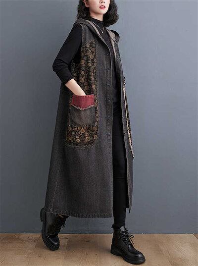 デニム ベスト コート レディース デニムベスト ジレ ノースリーブ ロングベスト アシンメトリー 花柄 プリント トップス フード付き 春 秋 大きいサイズ 前開き アウター 羽織り ボタン ベスト
