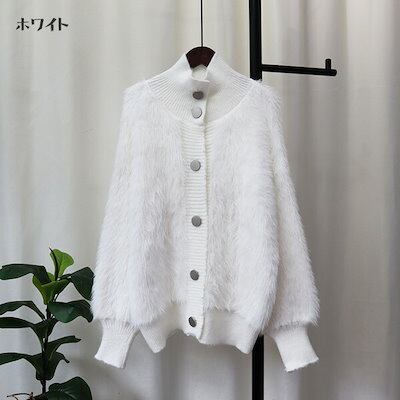 ニットカーディガン ファーカーディガン ファー ニット ショート丈 前開き レディース ボタン 無地 ファーニット ファー ニットウェア ふわふわ トップス セーター 長袖 立ち襟 ゆったり リブ セ