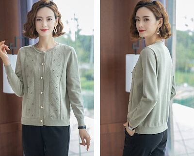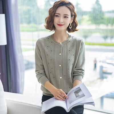レディース 婦人服 カーディガン アウター クルーネック 長袖 カットソー 羽織 トップス パール調ボタン ダイヤ柄 ビジュー 袖リブ ミセス シニア 40代 50代 60代 きれいめ きちんと感 清