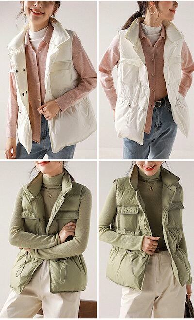 ダウンベスト レディース ジャケット スタンドカラー ダウン ウエストドロスト レディースコート 立ち襟 ジャケット ダブルボタン 胸ポケット付き キレイめ カジュアル 秋冬 アウター 女性 軽量 暖