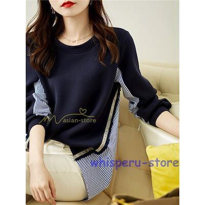 トレーナー レディース 春秋 トップス シャツ 切り替え カワイイ 長袖 Tシャツ 前後差 ゆったり 20代30代 レイヤード 重ね着風 女の子 ストライプ 無地 大人