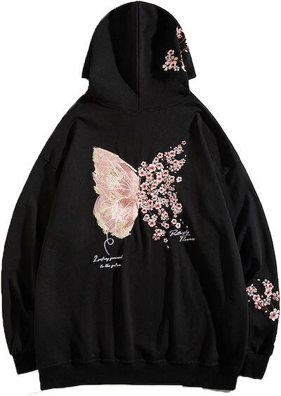 メンズ レディース 長袖 パーカー 刺繍 梅の花 胡蝶柄 個性的 ペアルック 柔らかい ビッグシルエット ストレッチ 保温性 吸汗 丈長め カジュアル クール オシャレ トップス 体型パカー プルオー