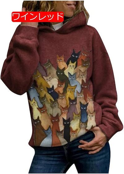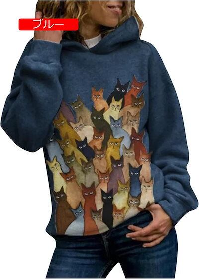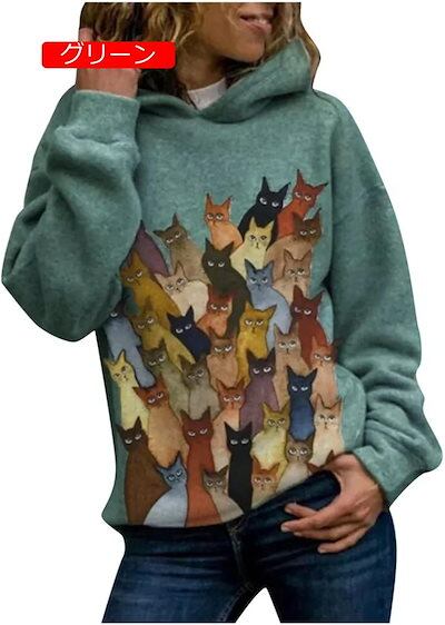 パーカー トレーナー メンズ レディース ねこ柄 可愛い カラフル 長袖 フード付き カジュアル シンプル ハンサム 丈長め ビッグシルエット 丸襟 体型パカー トップス プルオーバー 柔らかい オシ