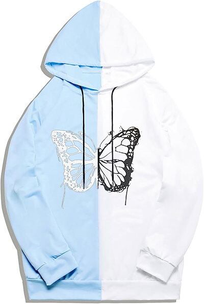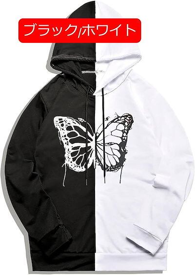 フルオーバー メンズ パッチワーク 蝶プリント 長袖パーカー フード付き カップル レディース 秋 春 大きいサイズ トップス 原宿風 ストリート系 柔らかい肌触り 薄手 日常着用 ウォーキング