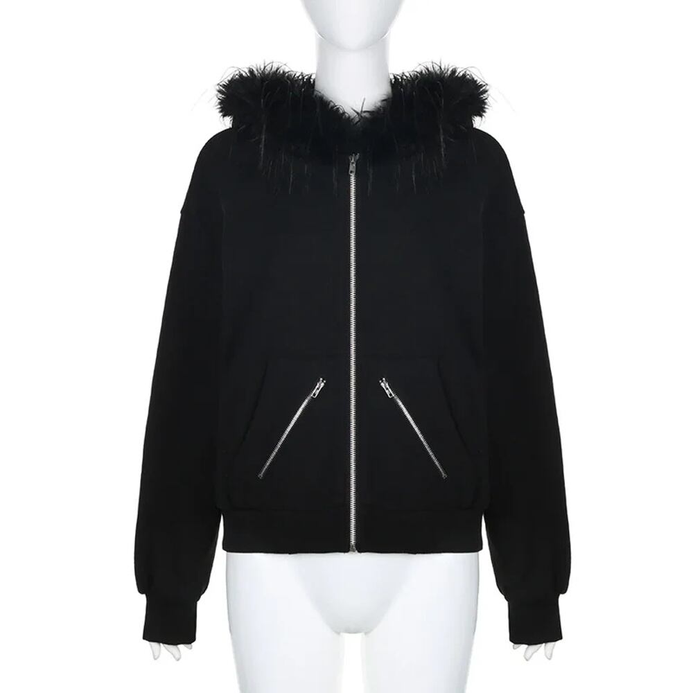 ゴスダークフェイクファーカラーフード付きカーディガン、ジップアップフーディー、ゴシックグランジポケット、秋ブラック、女性y2kストリートウェア、y2k パーカー ジャージ y2k T240908165444_01