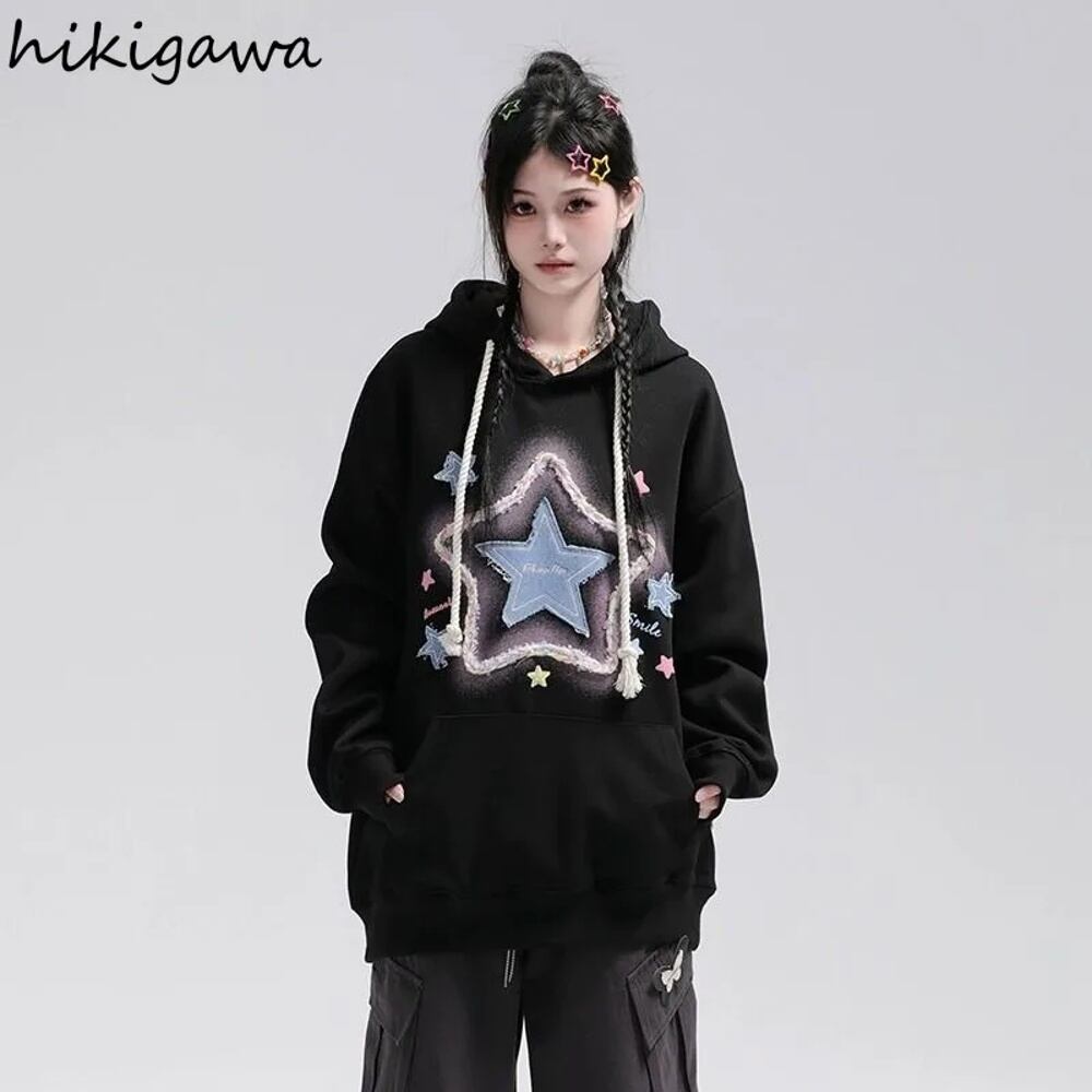 レディーススター刺embroideryオーバーサイズフーディー、原宿フード付きスウェットシャツ、カジュアルストリートウェア、10代の衣装、和風ファッション、y2k パーカー ジャージ y2k T240908170034_02