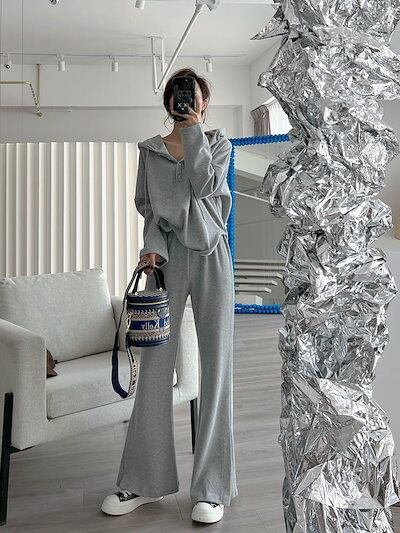 ファッションスーツ レディース 夏服早秋 カジュアル スポーツ着痩せ長袖アウタートップス+フレアパンツ 2点セット