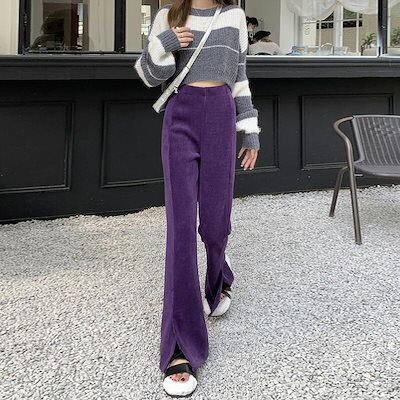 フレアパンツ フロントスリット リブ パンツ ボトムス レディース ズボン ロング丈 ストレッチ ワイド ハイウエスト コーデュロイ カジュアル きれいめ 大人 秋