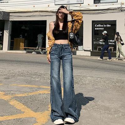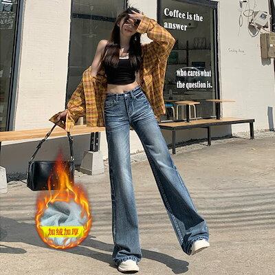 裏起毛パンツ アメリカンレトロなローライズワイド脚マイクロフレアジーンズレディース24の新作ゆったりとしたドレープ感のモップパンツ