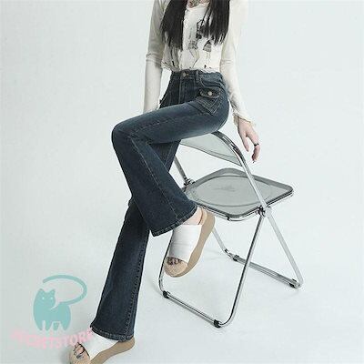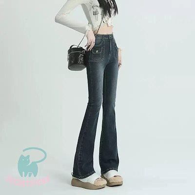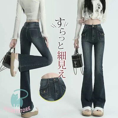 フレアパンツ レディース ジーンズ ズボン ボ ハイウエスト ロング丈 カシュアル 体型カバー 着痩せ 美脚 春秋 細身 ストレッチ