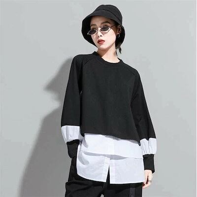 パーカー レディース 異素材レイヤード風トップス スウェット レディース 長袖 モード系 個性的 スウェット トレーナー プルオーバー トップス ドッキング フェイクレイヤード 重ね着風 無地 大人