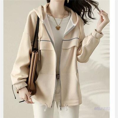 パーカー ジップアップパーカー レディース 長袖 前開き フード付き トップス アウター 無地 カジュアル ゆったり シンプル エレガント 上品 春秋