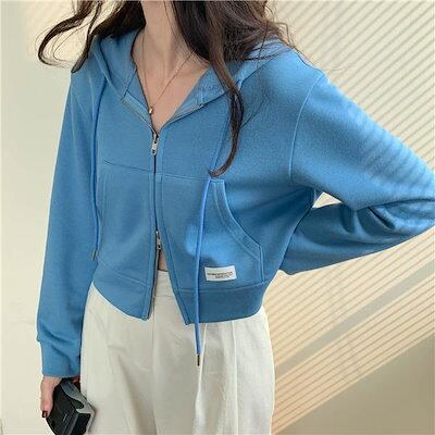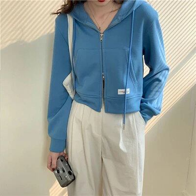 ジップアップ パーカー レディース スウェットパーカー ショート丈 春秋 前開き 長袖 カジュアル 羽織り アウター フード付 無地 体型カバー