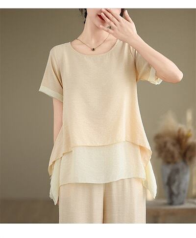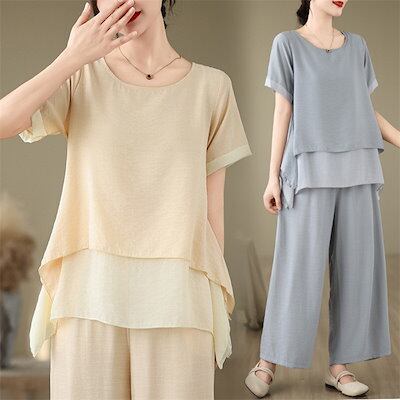 セットアップ 夏 レディース 綿麻風 2点セット フレア 上下セット チュニック Tシャツ& ワイドパンツ 半袖 バギーパンツ イージー フレアパンツ 涼しい カジュアル ナチュラル 大きいサイ