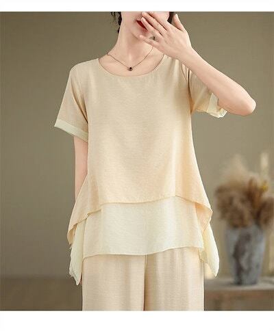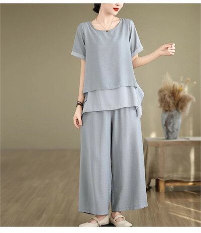 セットアップ 夏 レディース 綿麻風 2点セット フレア 上下セット チュニック Tシャツ&ワイドパンツ 半袖 バギーパンツ イージー フレアパンツ 涼しい カジュアル ナチュラル 大きいサイズ ゆっ