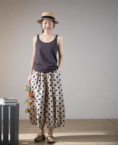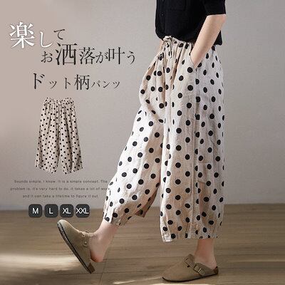 ワイドパンツ レディース 夏 コットン リネン パンツ ガウチョパンツ 綿麻風パンツ ドット 水玉柄 チノパン ズボン 九分丈 ボトムス イージーパンツ バギーパンツ 大きいサイズ ゆったり 体型カバ