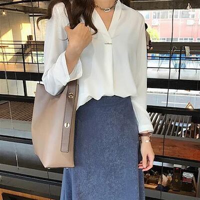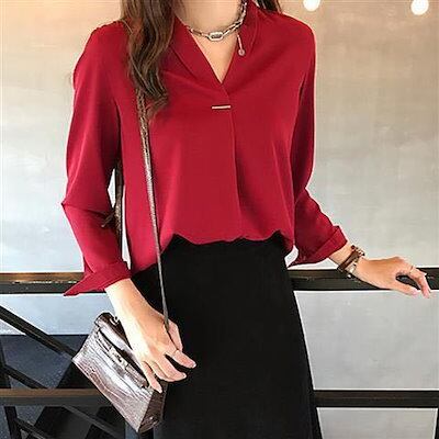 春新品シャツトップス通勤Tシャツシフォン韓国ファッション可愛い 長袖 Vネック無地レディースゆったり