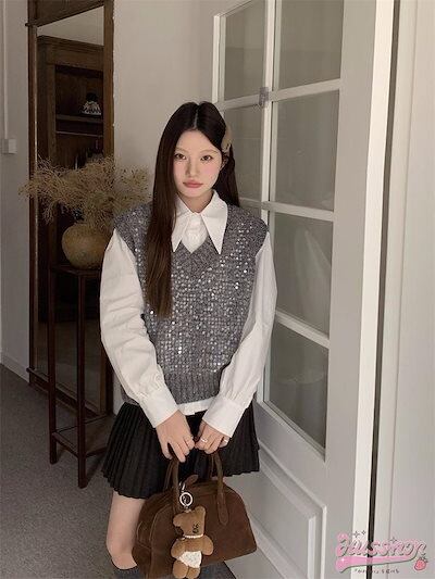 トップス ベスト ニット セーター Vネック スパンコール キラキラ ゆったり 白 春 韓国ファッション レディース おしゃれ かわいい カジュアル お出かけ
