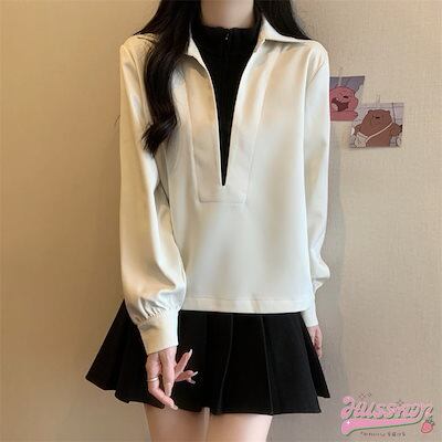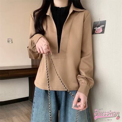 2024春夏レディース 重ね着風襟付きシャツ トップス シャツ 重ね着風 バイカラーシャツ 襟付き 長袖 フェイクレイヤードシャツ プルオーバー Vネック オシャレ シンプル 可愛い キレイめ