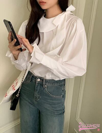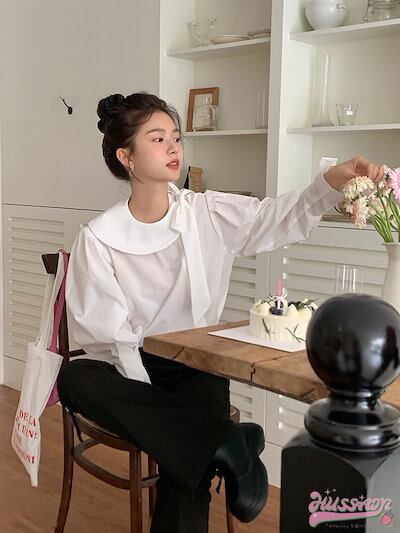 2024春夏トップス シャツ ブラウス リボン 長袖 ランタン袖 襟 春 白 ホワイト ゆったり かわいい ガーリー 甘め おしゃれ 韓国ファッション レディース お出かけ