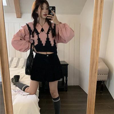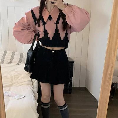 2024 春夏【2点セット】カジュアルにも シャツ ニット ベスト ブラウス バルーン ボリューム ショート風ゆったり ネック カジュアル きれいめ 韓国っぽ ファッション かわいい