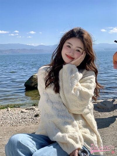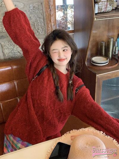 トップス ニット セーター ラウンドネック 長袖 ゆったり 編み模様 春 白 赤 韓国ファッション レディース おしゃれ かわいい カジュアル お出かけ