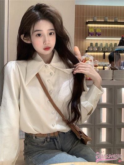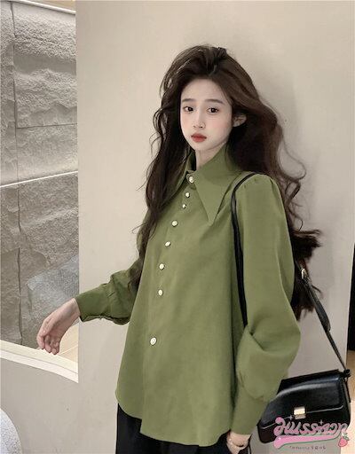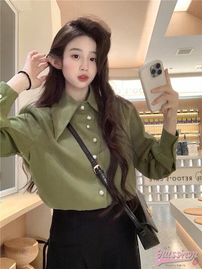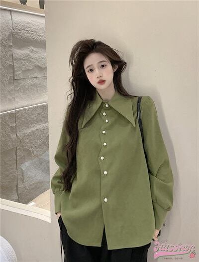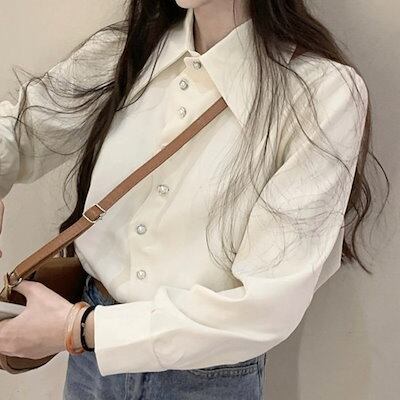 トップス シャツ 長袖 襟 スタンダードカラー ボタン 春 白 緑 ゆったり 丈長め かわいい おしゃれ 韓国ファッション レディース お出かけ