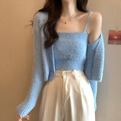 2024 秋冬かわいい人気 トップス 長袖 ニット無地レディースショート 羽織りファッション系 ルーズ ネック女っぽカジュアルボレロゆったり 大人っぽ春セーターフレンチ型 2点