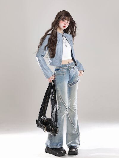 2024秋冬 長袖 ジャケット かわいい ハイネックスタンドネックショート アウター丈羽織り合成バイカラーフェイク黑カジュアル シルエットゆったりファッション系サイズ 色っぽ 女っぽきれいめ大人っぽ