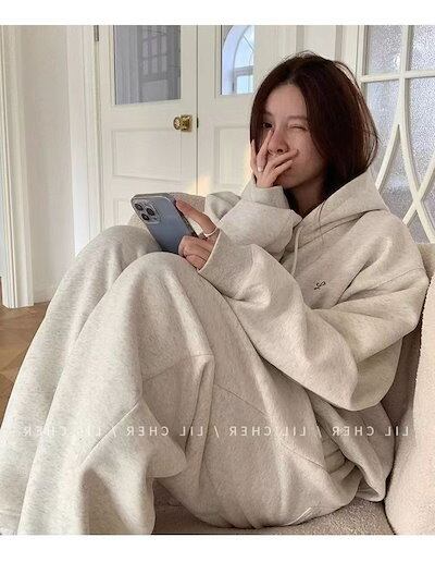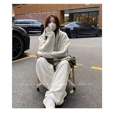2024 秋冬 2点セット トップス フード付き 羽織り ショート丈 長袖 大人可愛い カジュアル上下ボトムス ストレート系ファッション冬 フル ルーズ サイドゆったりサイズワイドシルエットリラック