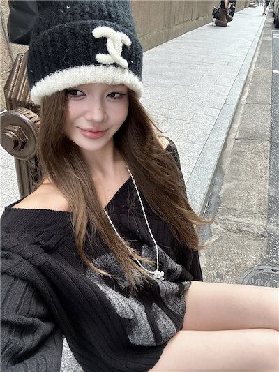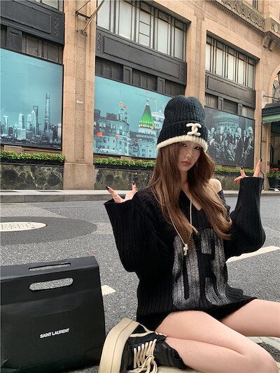 2024秋冬ニット Vネック オーバーサイズ レタープリント トップス ワンショルダー 長袖 レトロ 韓国ファッション レディース 大人可愛い ガーリー カジュアル
