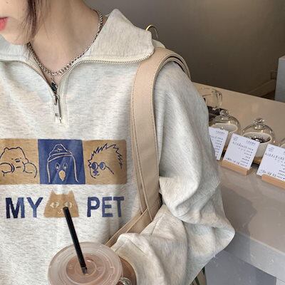 2024 秋冬 2TYPE 裹起毛トップス長袖 かわいいK-POPTロングレディース韓国風ロゴ衣装カラールーズゆったりカジュアルハーフおしゃれサイズスリーブシルエットファッション系サイドシャツフット