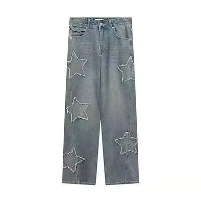 脚長効果!スキニーデニムパンツ アメリカンスタイル レトロ スター ジーンズ レディース 秋 韓国 ハイウエスト 薄手 ローエッジ 刺繍 ストレート