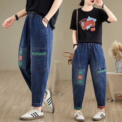 「ファットガール」 夏 刺繍 デーパードパンツ デニムパンツ ジーンズ ゴム 薄手 体型カバー 大きいサイズ ゆったり レディース