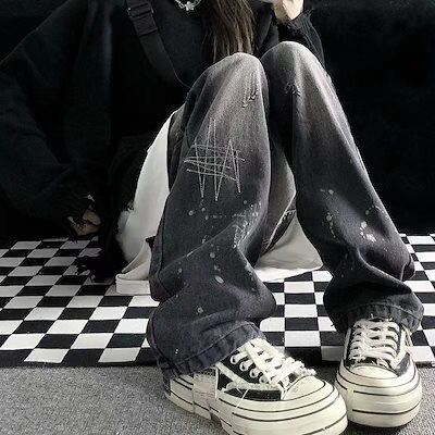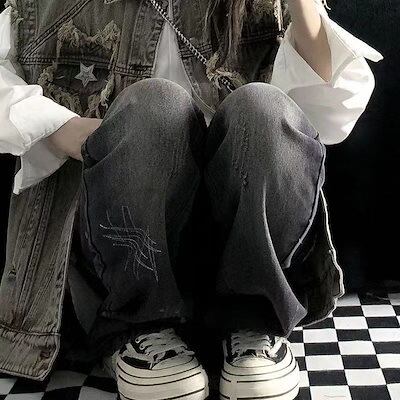 おしゃれ トレンド 刺繍 ジーンズ レトロ ハイウエスト ストレート ロングパンツ ゆったり 百掛け デニム ワイドパンツ