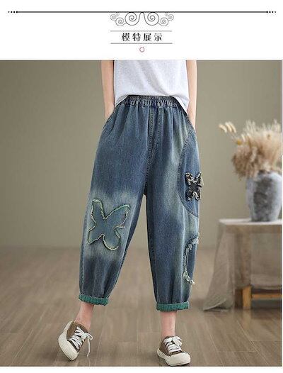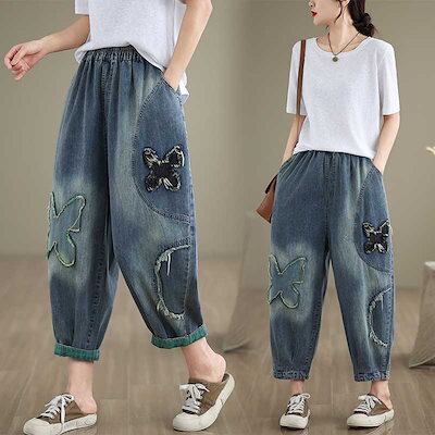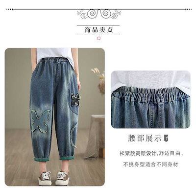 「ファットガール」 2024初秋 九分丈 デニムパンツ 大きいサイズ ジーンズ 蝶柄刺繍 体型カバー レディース ゴム ロングパンツ メガ割