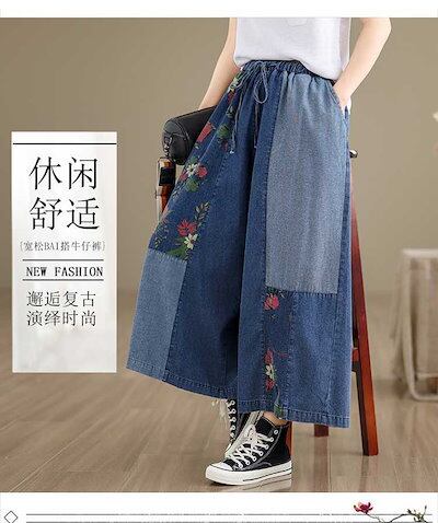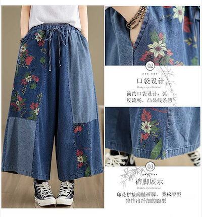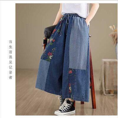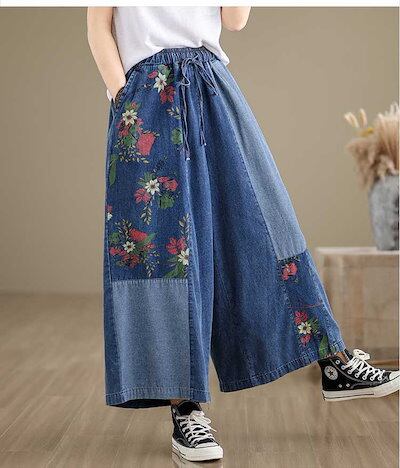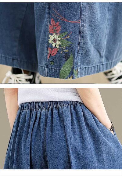 「ファットガール」 夏 デニム ワイドパンツ 刺繍 レトロ 薄手 ドッキング ワイドパンツ 体型カバー 大きいサイズ ゆったり レディース