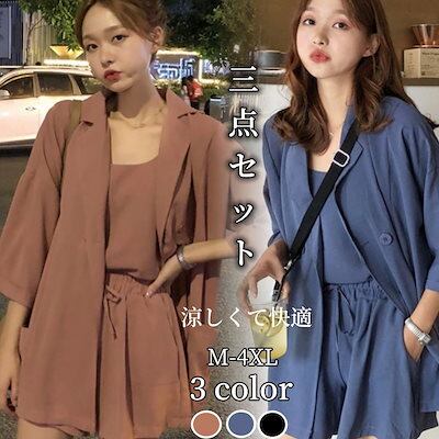 セットアップ 三点セット 夏 シフォンシャツ スーツアウター+ キャミソール ワイシャツ+ショートパンツ 韓国ファッションセットアップ レディース