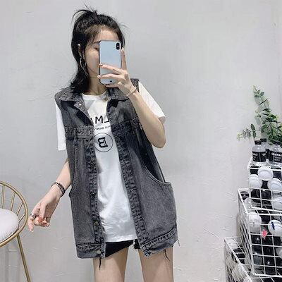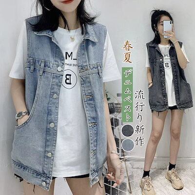2024 春 夏 デニムベスト レディースおしゃれ ゆったり セミロング ノースリーブ デニムジャケット ベスト