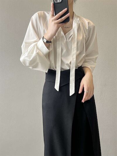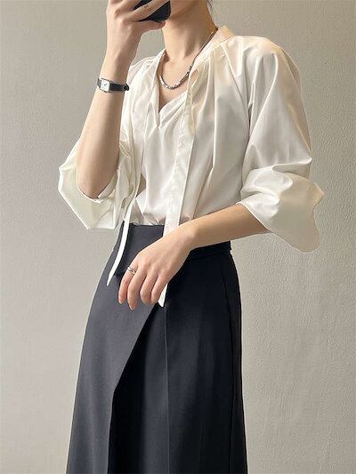 ブラウス ボウタイ 長袖 レディース トップス シャツ 白シャツ 春夏 きれいめ リボンタイ リボン スーツインナー ショート丈 シャツブラウス 長袖ブラウス ボリューム袖 シンプル とろみ 大人 お