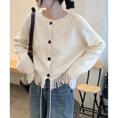 フリンジニットカーディガン クルーネック ニットカーディガン レディース アウター 秋冬 新作 ミディアム丈 羽織り ゆったり