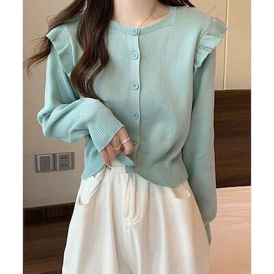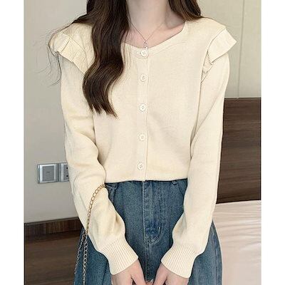 ニットカーディガン ショルダーフリル ニットカーディガン レディース アウター 秋冬 新作 ミディアム丈 羽織り ゆったり